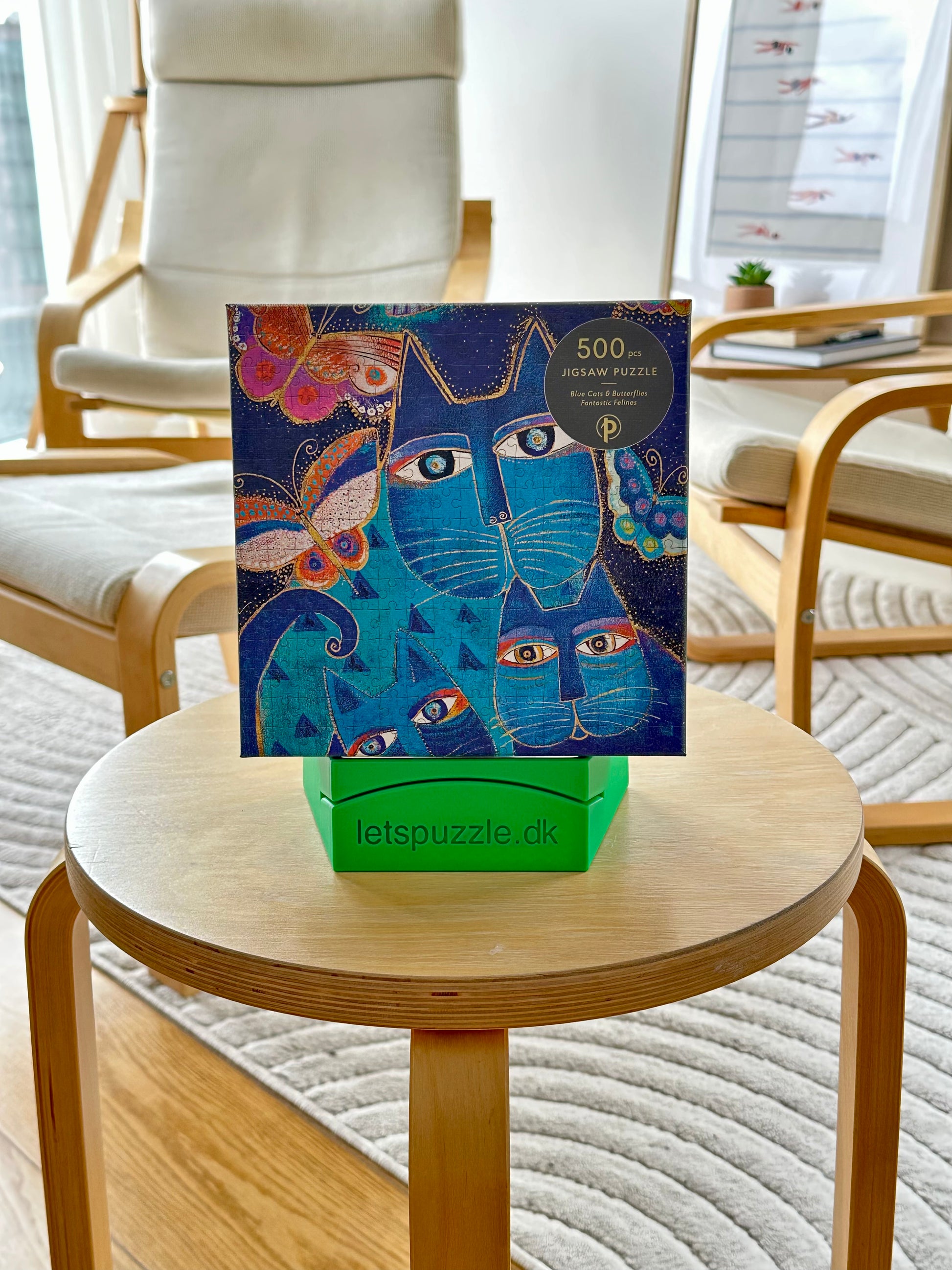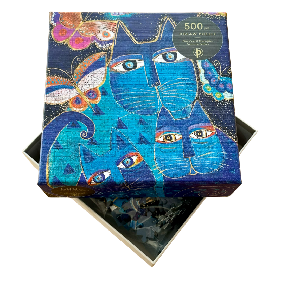De sødeste blå katter sidder her og kigger på dig, mens du lægger alle brikkerne på plads i det her 500 brikker puslespil med glimmereffekt. Er super fint og enkelt motiv illustreret af Laurel Burch.
