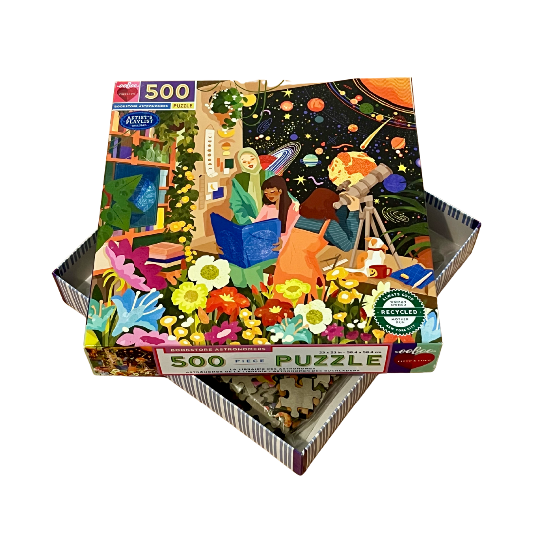 Tag et kig på nysgerrige og undersøgende kvinder, der skuer mod rummets mysterier og det ukendte. Imens deler de viden, perspektiver og venskab med hinanden i denne unikke boghandel.